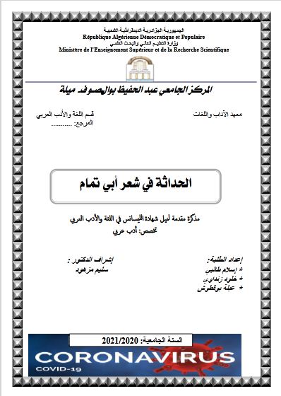 طالبي اسلام et al. (2021). الحداثة في شعر أبي تمام (ليسانس- ل م د) . المركز الجامعي عبد الحفيظ بوالصوف ميلة.