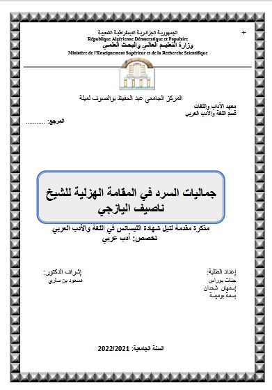 بوراس جنات et al. (2021). جماليات السرد في المقامة الهزلية للشيخ ناصيف اليازجي (ليسانس- ل م د) . المركز الجامعي عبد الحفيظ بوالصوف ميلة.