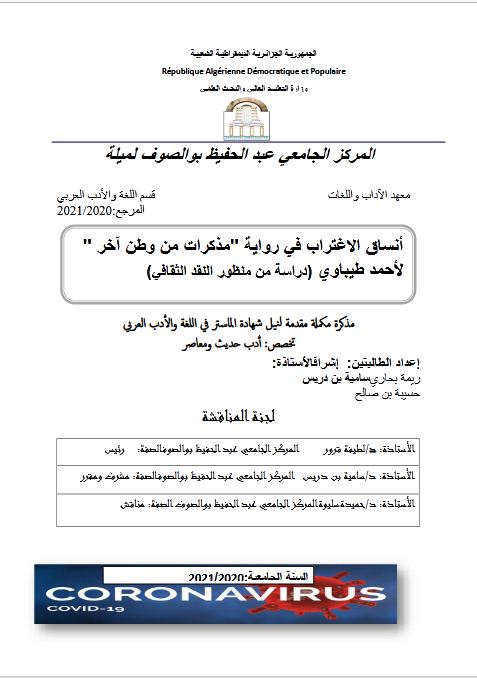 بحاري ريمة et al. (2021). أنساق الاغتراب في رواية مذكرات من وطن آخر لأحمد طيباوي دراسة من منظور النقد الثقافي (ماستر- ل م د) . المركز الجامعي عبد الحفيظ بوالصوف ميلة.