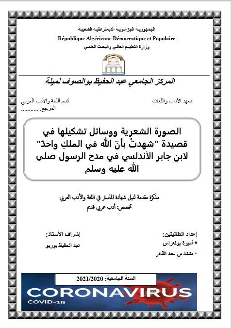 بولعراس أميرة et al. (2021). الصورة الشعرية ووسائل تشكيلها في قصيدة شهدت بأن الله في الملك واحد لابن جابر الاندلسي في مدح الرسول صلى الله عليه وسلم (ماستر- ل م د) . المركز الجامعي عبد الحفيظ بوالصوف ميلة.