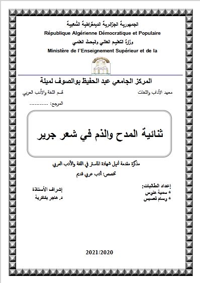 هنوس سمية et al. (2021). ثنائية المدح والذم في شعر جرير (ماستر- ل م د) . المركز الجامعي عبد الحفيظ بوالصوف ميلة.