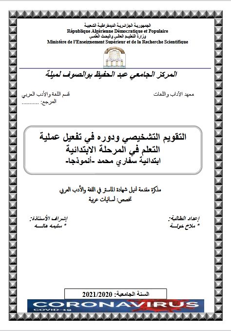 ملاخ خولة & سليمة هالة(مشرفا) (2021). التقويم التشخيصي ودوره في تفعيل عملية التعلم في المرحلة الابتدائية ابتدائية سفاري محمد انمودجا (ماستر- ل م د) . المركز الجامعي عبد الحفيظ بوالصوف ميلة.