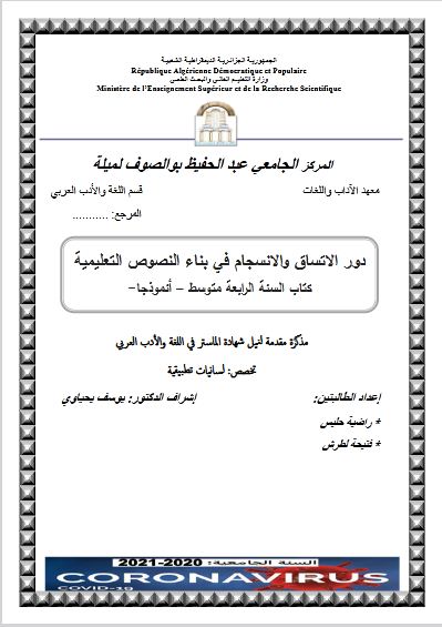 حليس راضية et al. (2021). دور الاتساق والانسجام في بناء النصوص التعليمية كتاب السنة الرابعة متوسط انمودجا (ماستر- ل م د) . المركز الجامعي عبد الحفيظ بوالصوف ميلة.