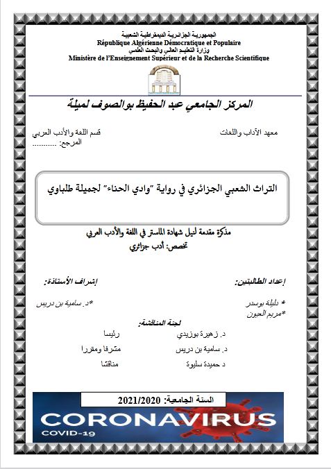 بوسدر دليلة et al. (2021). التراث الشعبي الجزائري في رواية وادي الحناء لجميلة طلباوي (ماستر- ل م د) . المركز الجامعي عبد الحفيظ بوالصوف ميلة.