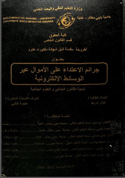 شريط كوثر & طالبي حليمة (مشرفا و مقررا) (2020). جرائم الإعتداء على الأموال عبر الوسائط الإلكترونية (دكتوراه) . عنابة.
