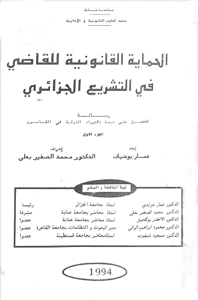 عمار بوضياف & محمد الصغير بعلي (1994). الحماية القانونية للقاضي في التشريع الجزائري (دكتوراه) . عنابة.