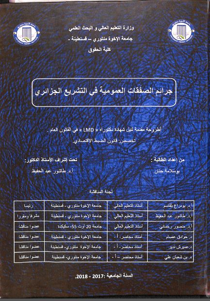 بوسلامة حنان & طاشور عبدالحفيظ ( مشرفا ومقررا ) (2018). جرائم الصفقات العمومية في التشريع الجزائري (دكتوراه) . قسنطينة.