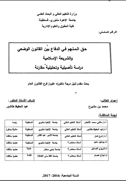 بن مشيرح محمد & طاشور عبد الحفيظ مشرفا ومقررا) (2021). حق المتهم في الدفاع بين القانون الوضعي والشريعة الإسلامية دراسة تأصيلية وتحليلية مقارنة (دكتوراه) . قسنطينة.