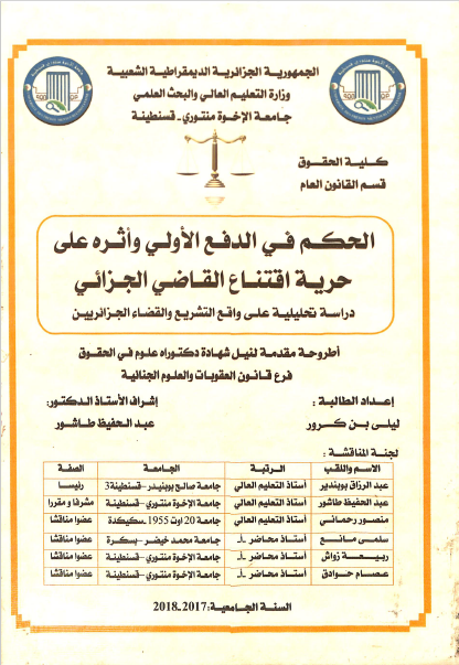 ليلى بن كرور & طاشور عبدالحفيظ ( مشرفا ومقررا ) (2018). الحكم في الدفع الاولي واثره على حرية اقتناع القاضي الجزائي (دكتوراه) . قسنطينة.