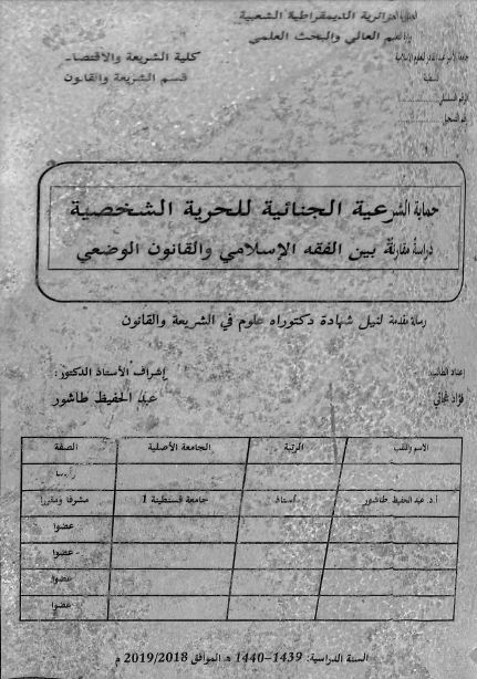 فؤاد غجاتي & طاشور عبدالحفيظ ( مشرفا ومقررا ) (2019). حماية الشرعية الجنائية للحرية الشخصية (دكتوراه.) . قسنطينة.