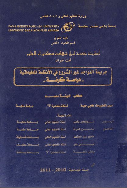 خليفة محمد & طالبي حليمة (مشرفا و مقررا) (2011). جريمة التواجد غير المشروع في الانظمة المعلوماتية (دكتوراه) . عنابة.