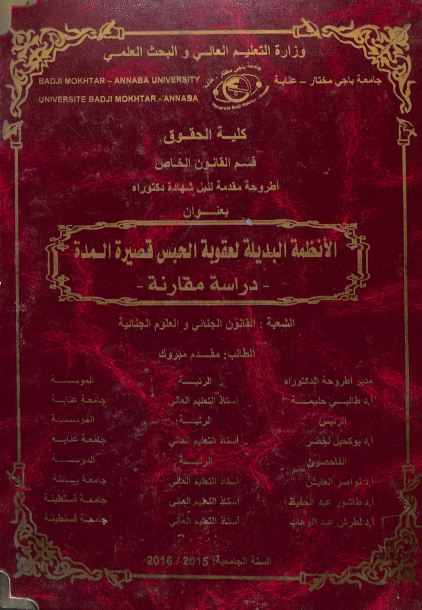 مقدم مبروك & طالبي حليمة (مشرفا و مقررا) (2016). الأنظمة البديلة لعقوبة الحبس قصيرة المدة دراسة مقارنة (دكتوراه) .