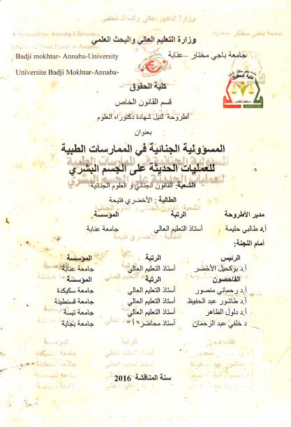 الأخضري فتيحة & طالبي حليمة (مشرفا و مقررا) (2017). المسؤولية الجنائية في الممارسات الطبية للعمليات الحديثة على الجسم البشري (دكتوراه) . عنابة.