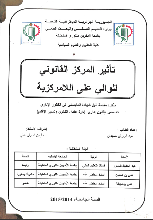 حميدان عبد الرزاق & بن شعبان علي(مشرفا ومقررا) (2015). تأثير المركز القانوني للوالي على اللامركزية (ماجستير) . قسنطينة.