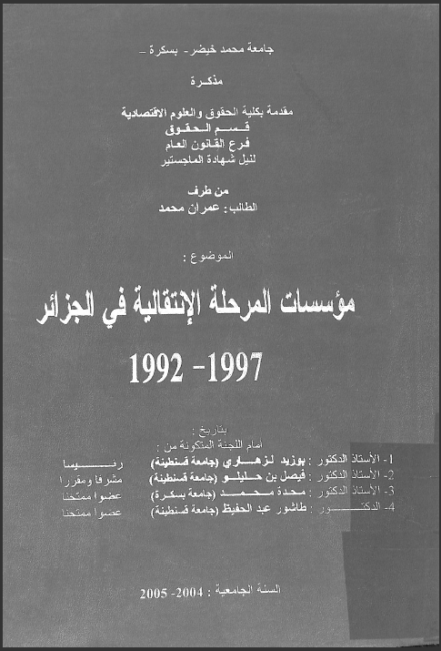 عمران محمد & بن حليلو فيصل (مشرفا ومقررا) (2005). مؤسسات المرحلة الإنتقالية في الجزائر 1997-1992 (ماجستير) . بسكرة.