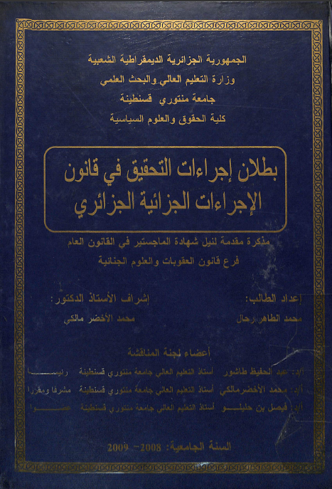 رحال محمد الطاهر & مالكي محمد الأخضر (مشرفا ومقررا) (2009). بطلان إجراءات التحقيق في قانون الإجراءات الجزائية الجزائري (ماجستير) . قسنطينة.