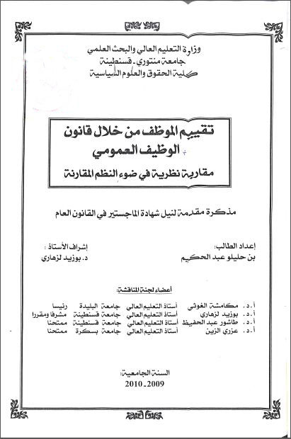 بن حليلو عبد الحكيم & بوزيد لزهاري (مشرفا ومقررا) (2010). تقييم الموظف من خلال قانون الوظيف العمومي : مقاربة نظرية في ضوء النظم المقارنة (ماجستير) . قسنطينة.