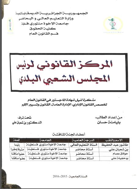 بليامنة حسان & بن شعبان علي(مشرفا ومقررا) (2016). المركز القانوني لرئيس المجلس الشعبي البلدي (ماجستير) . قسنطينة.