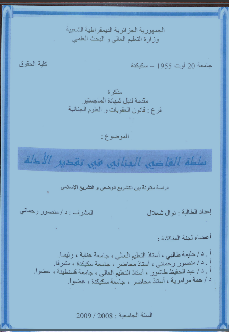 شعلال نوال & رحماني منصور(مشرفا ومقررا) (2009). سلطة القاضي الجنائي في تقدير الأدلة دراسة مقارنة بين التشريع الوضعي والتشريع الإسلامي (ماجستير) . سكيكدة.