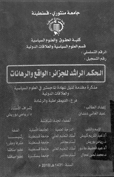 دندان عبد الغاني & بوريش رياض(مشرفا ومقررا) (2010). الحكم الراشد للجزائر الواقع والرهانات (ماجستير) . قسنطينة.
