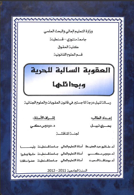 بحري نبيل & دردوس مكي(مشرفا ومقررا) (2012). العقوبة السالبة للحرية و بدائلها (ماجستير) . قسنطينة.