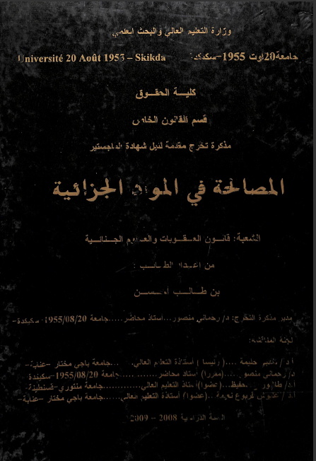 بن طالب أحسن & رحماني منصور(مشرفا ومقررا) (2009). المصالحة في المواد الجزائية (ماجستير) . سكيكدة.