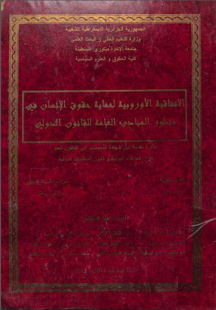 جغري أميرة & بوريش رياض(مشرفا ومقررا) (2012). الاتفاقية الأوروبية لحماية حقوق الإنسان في منظور المبادئ العامة للقانون الدولي (ماجستير) . قسنطينة.