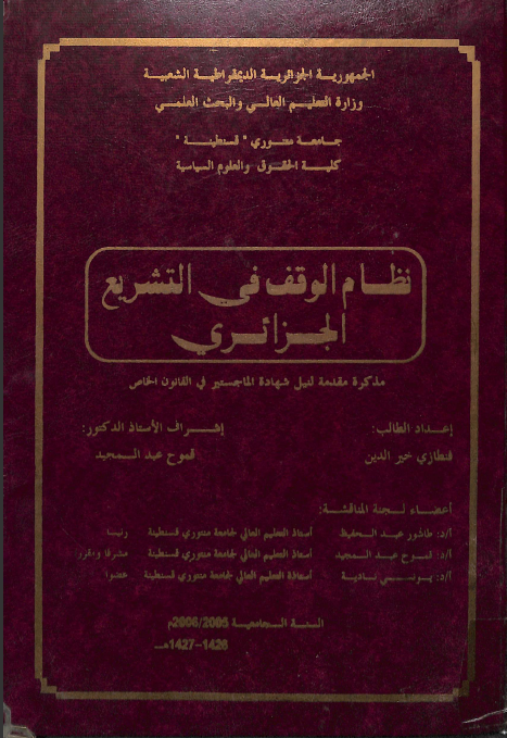 فنطازي خير الدين & قموح عبد المجيد(مشرفا ومقررا) (2006). نظام الوقف في التشريع الجزائري (ماجستير) . قسنطينة.