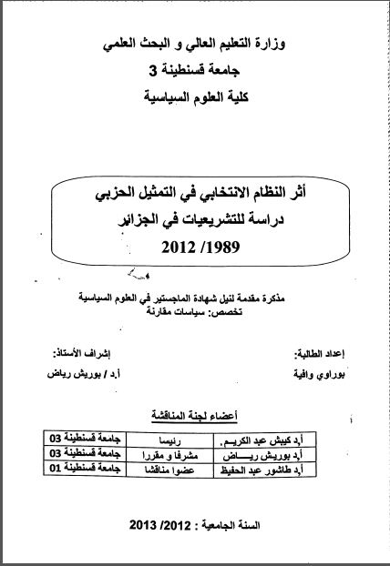 بوراوي وافية & بوريش رياض(مشرفا ومقررا) (2013). أثر النظام الإنتخابي في التمثيل الحزبي دراسة للتشريعيات في الجزائر 2012/1989 (ماجستير) . قسنطينة.