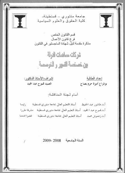 بوذراع أميرة حرم بصاح & قموح عبد المجيد(مشرفا ومقررا) (2009). شركات مساهمات الدولة بين خصخصة التسيير والخوصصة (ماجستير) . قسنطينة.
