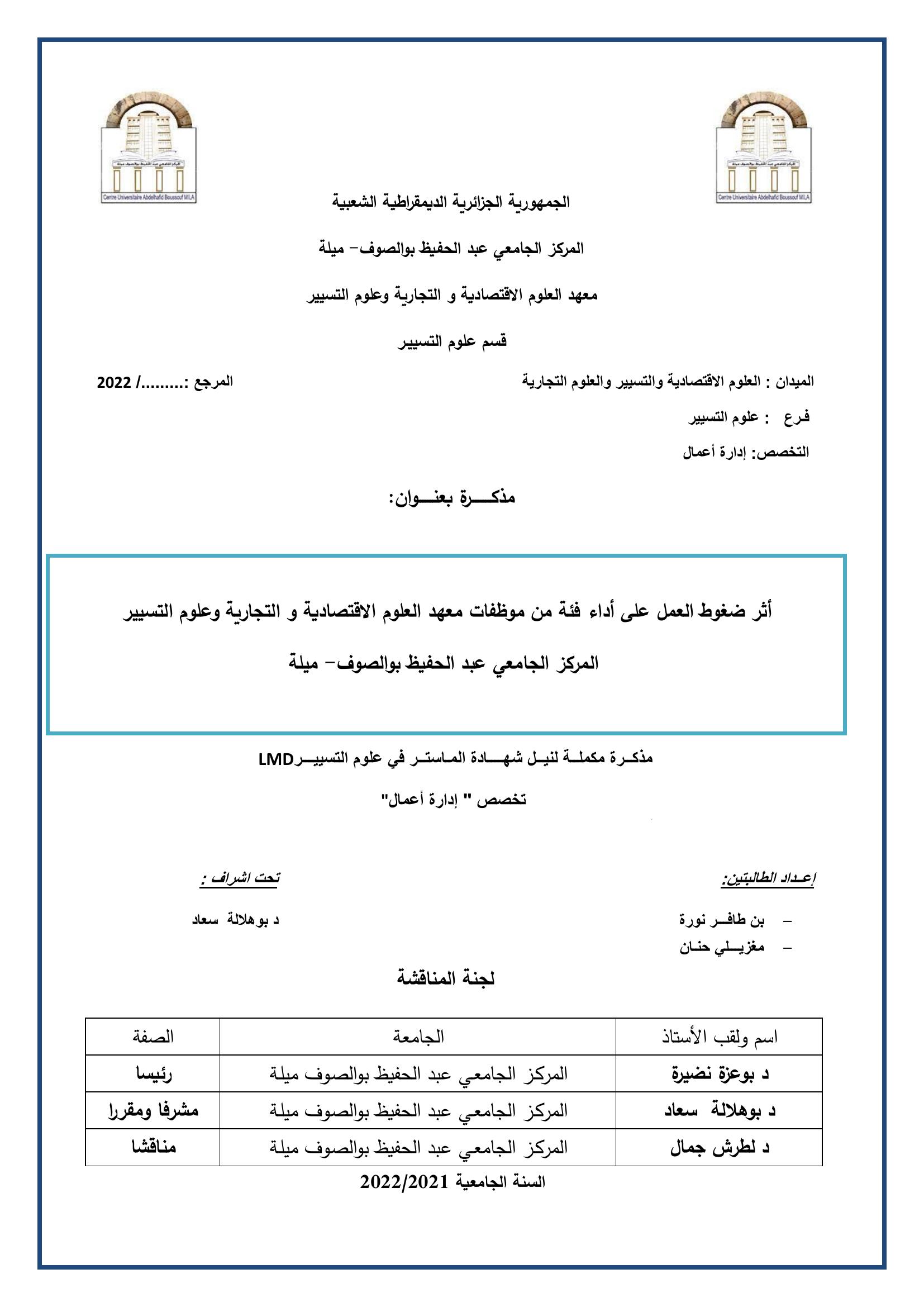أثر ضغوط العمل على أداء فئة من موظفات معهد العلوم الاقتصادية و التجارية وعلوم التسيير المركز الجامعي عبد الحفيظ بوالصوف ميلة