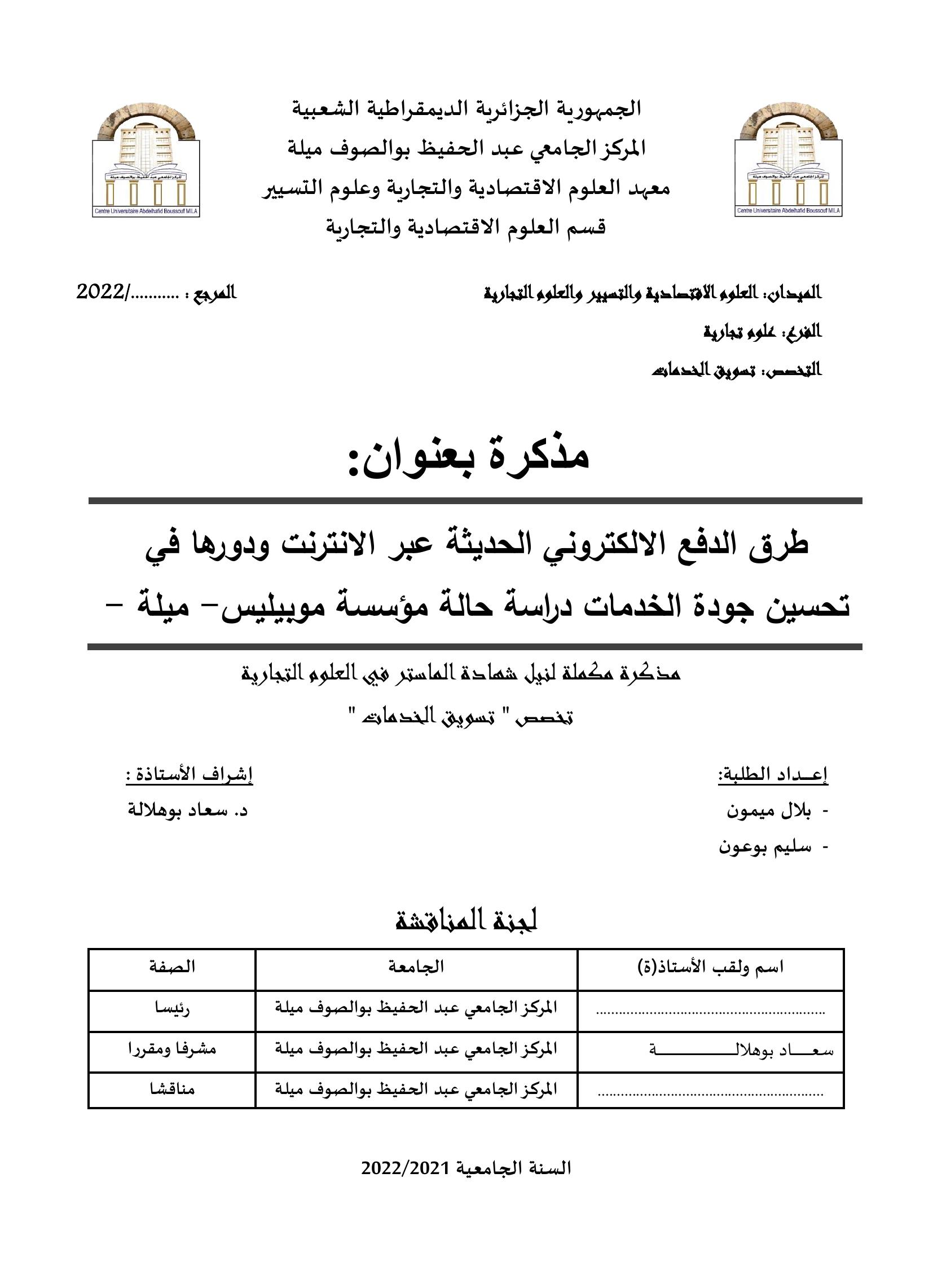 طرق الدفع الالكتروني الحديثة عبر الانترنت ودورها في تحسين جودة الخدمات دراسة حالة مؤسسة موبيليس- ميلة