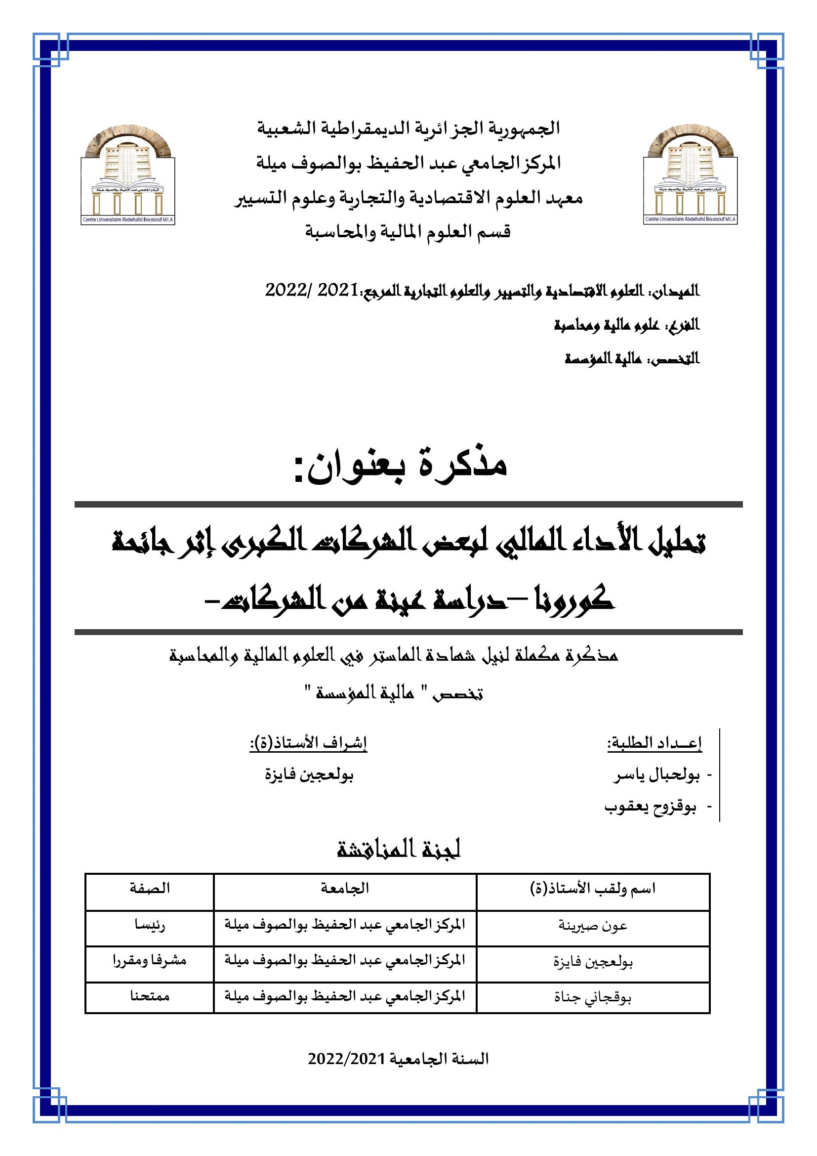 تحليل الأداء المالي لبعض الشركات الكبرى إ ثر جائحة كورونا - دراسة عينة من الشركا ت –