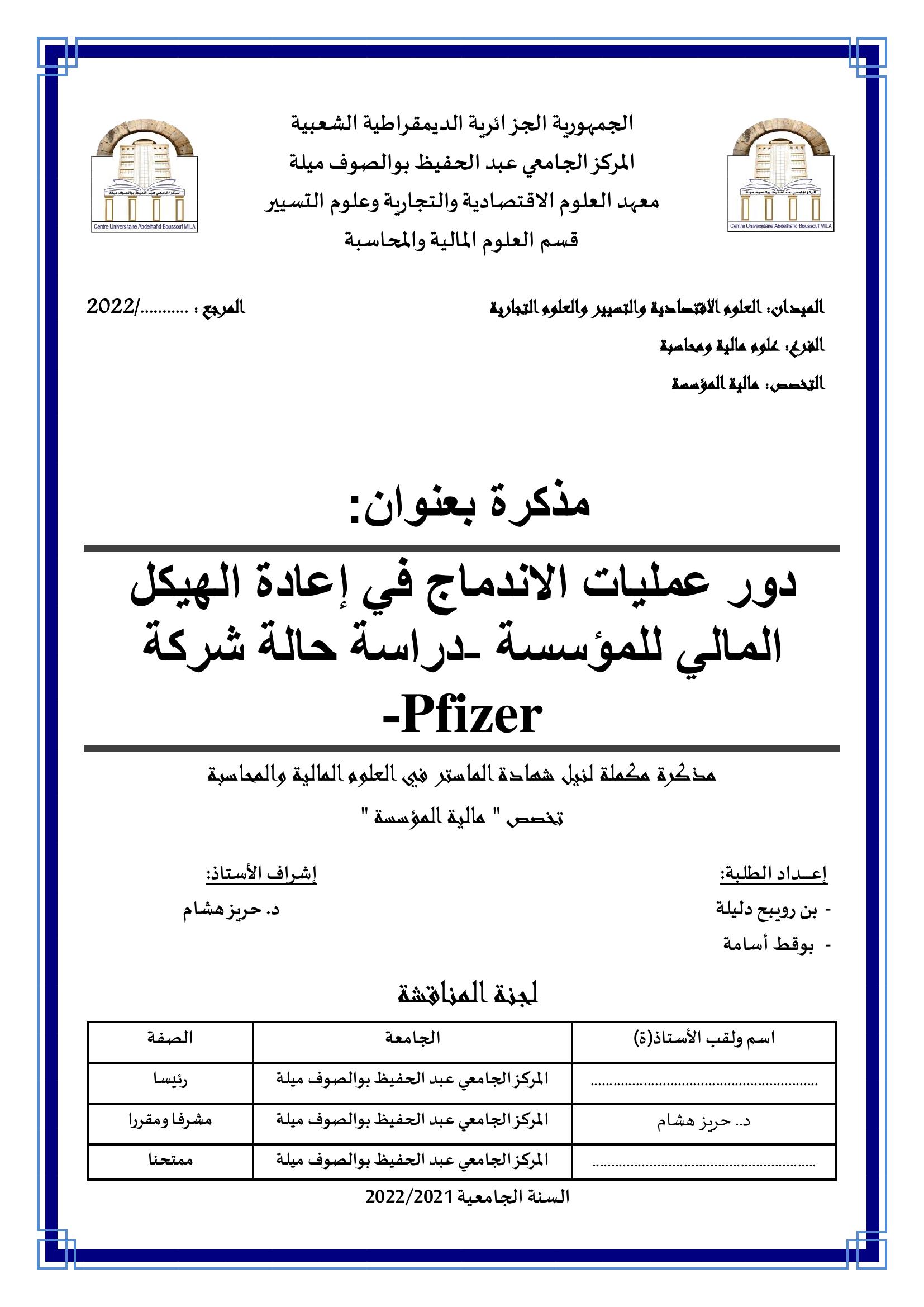 بن رويبح دليلة et al. (2022). دور عمليات الاندماج في إعادة الهيكل المالي للمؤسسة دراسة حالة شركة Pfizer (ماستر- ل م د) . ميلة.