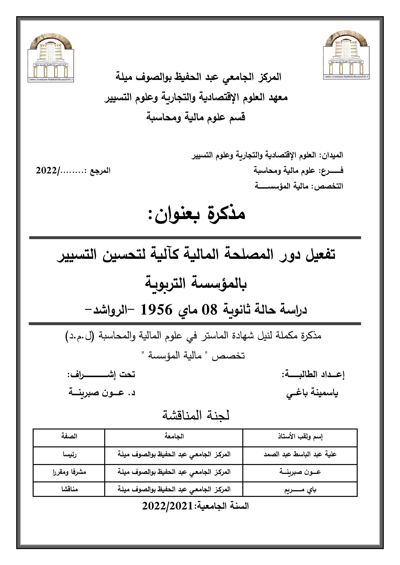 تفعيل دور المصلحة المالية كآلية لتحسين التسيير بالمؤسسة التربوية : دراسة حالة ثانوية 08 ماي 1956 -الرواشد-