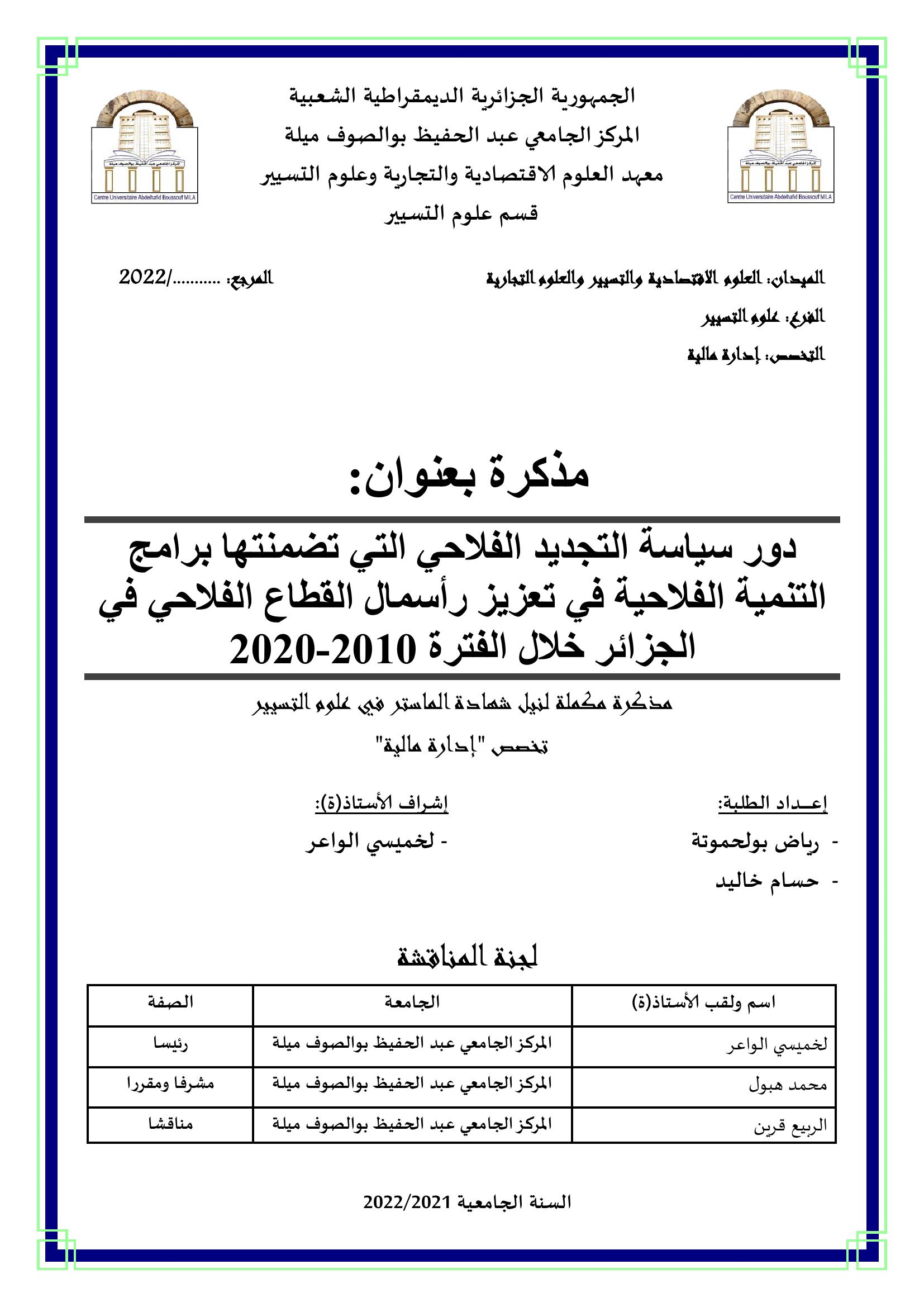 بولحموتة رياض et al. (2022). دور سياسة التجديد الفلاحي التي تضمنتها برامج التنمية الفلاحية في تعزيز رأسمال القطاع الفلاحي في الجزائر خلال الفترة 2010-2020 (ماستر- ل م د) . ميلة.