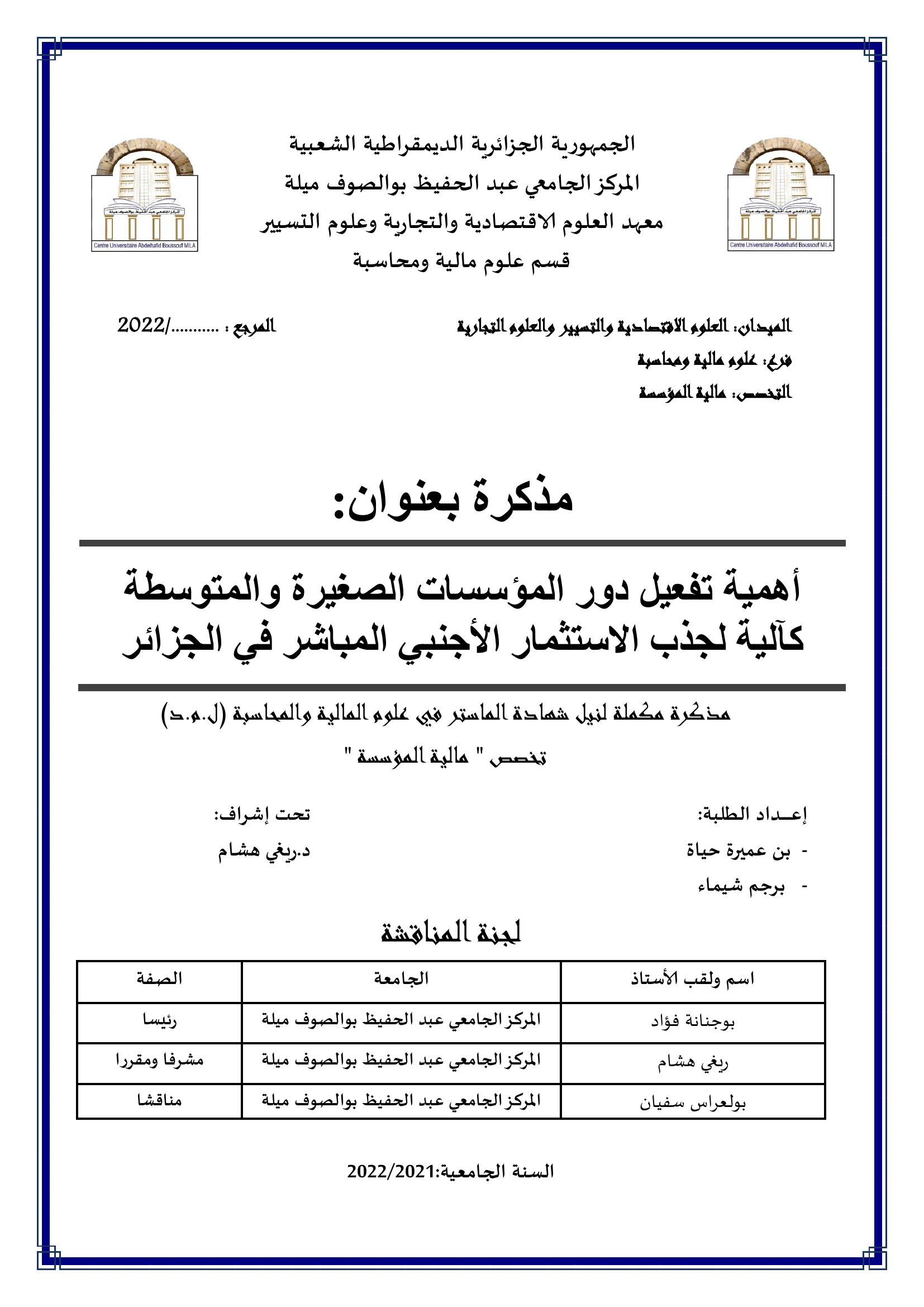 بن عميرة حياة et al. (2022). أهمية تفعيل دور المؤسسات الصغيرة والمتوسطة كآلية لجذب الاستثمار الأجنبي المباشر في الجزائر (ماستر- ل م د) . ميلة.