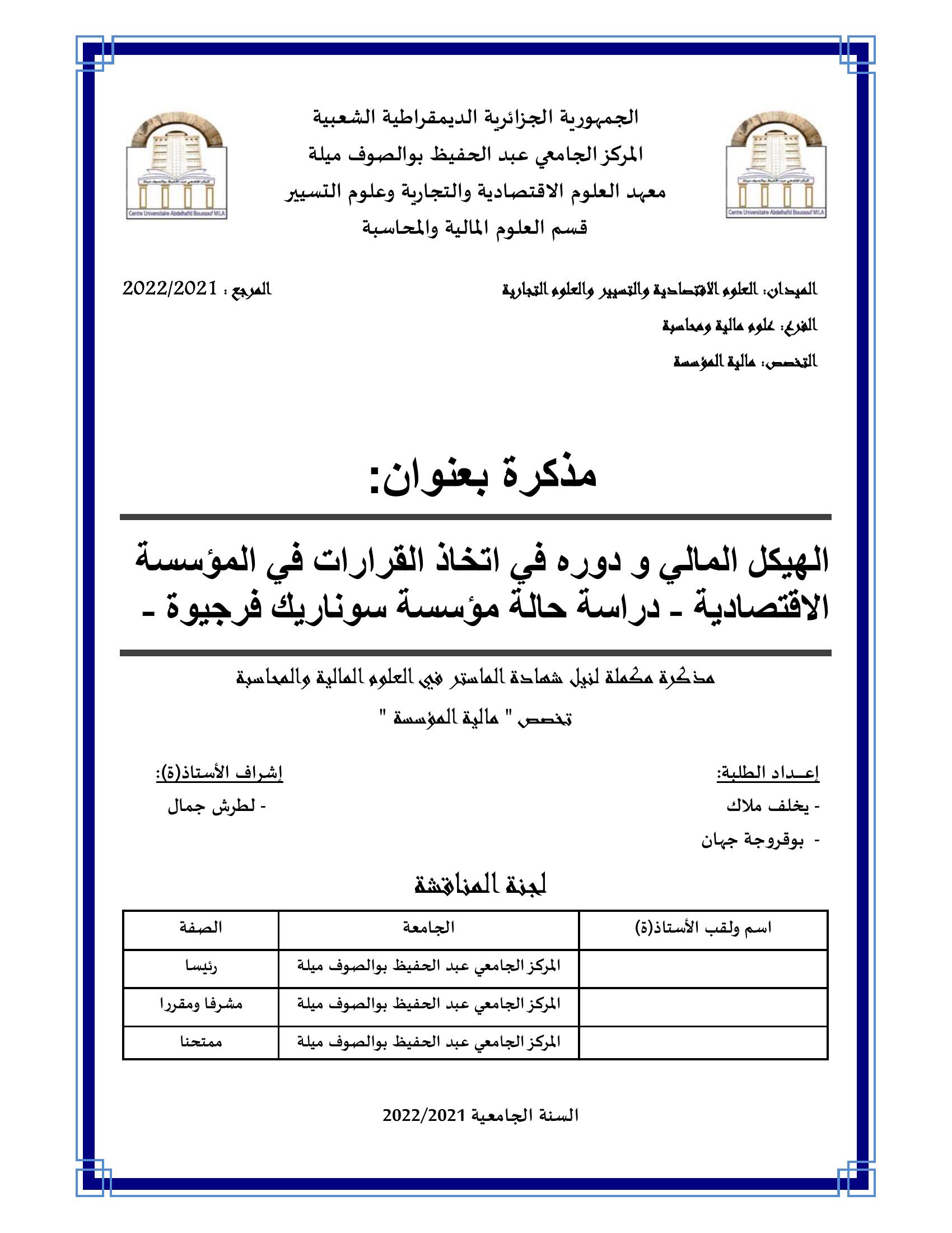 الهيكل المالي و دوره في اتخاذ القرارات في المؤسسة الاقتصادية : دراسة حالة مؤسسة سوناريك فرجيوة -