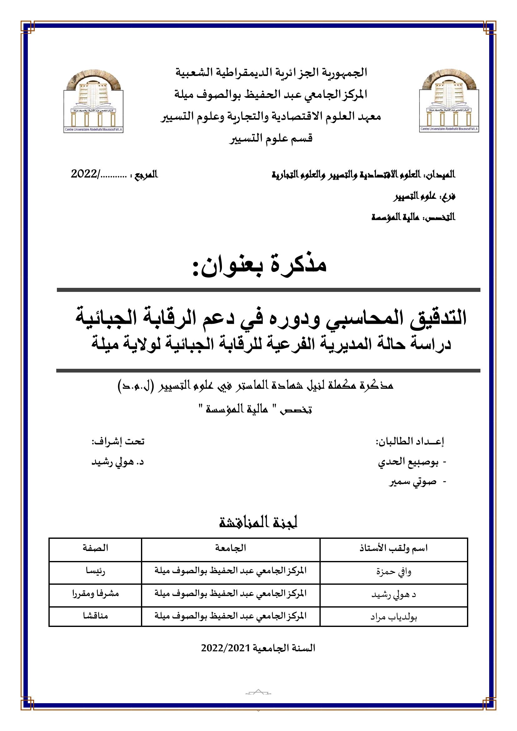 بوصبيع الحدي et al. (2022). التدقيق المحاسبي ودوره في دعم الرقابة الجبائية : دراسة حالة المديرية الفرعية للرقابة الجبائية لولاية ميلة (ماستر- ل م د) . ميلة.