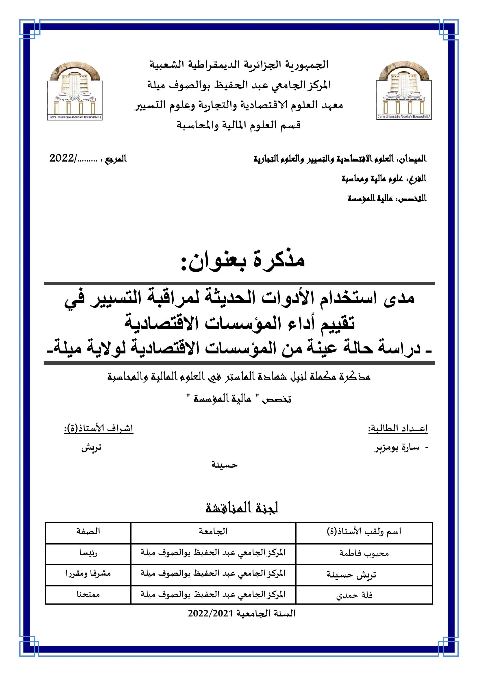 سارة بومزبر & محبوب فاطمة (رئيسا), ت. (2022). مدى استخدام الأدوات الحديثة لمراقبة التسيير في تقييم أداء المؤسسات الاقتصادية : دراسة حالة عينة من المؤسسات الاقتصادية لولاية- ميلة - (ماستر- ل م د) . ميلة.