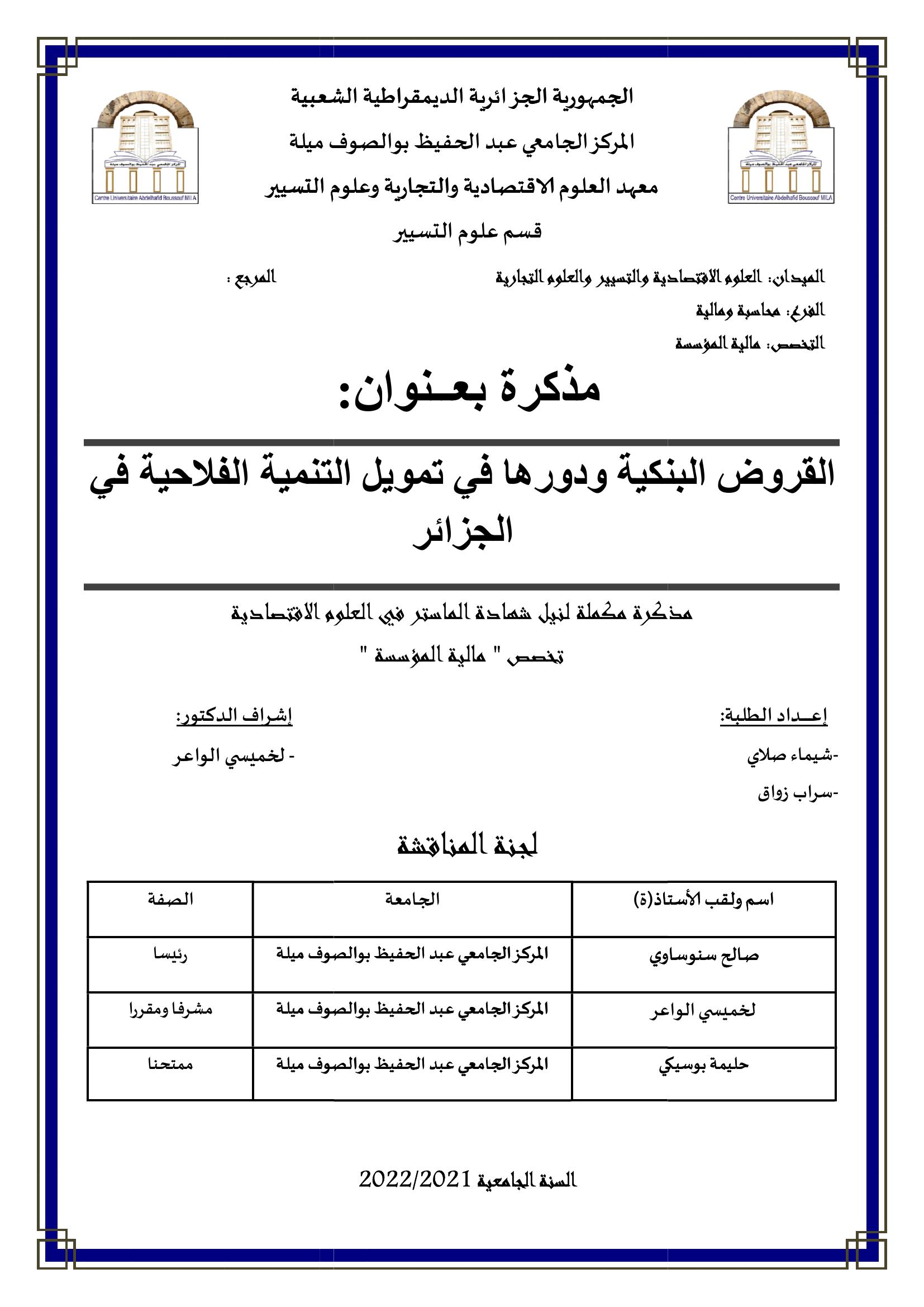 شيماء صلاي et al. (2022). القروض البنكية ودورها في تمويل التنمية الفلاحية في الجزائر (ماستر- ل م د) . ميلة.