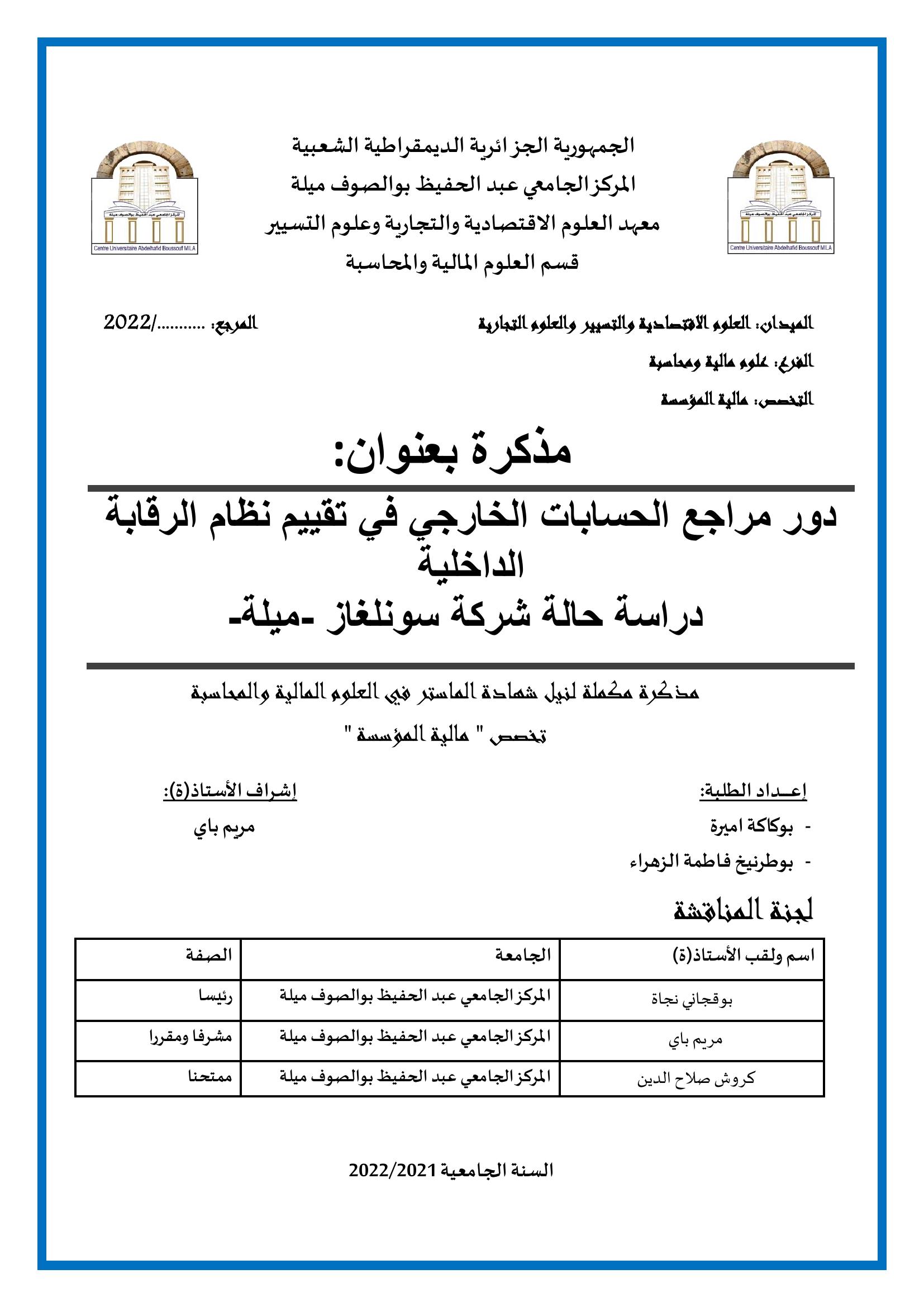 دور مراجع الحسابات الخارجي في تقييم نظام الرقابة الداخلية : دراسة حالة شركة سونلغاز -ميلة -
