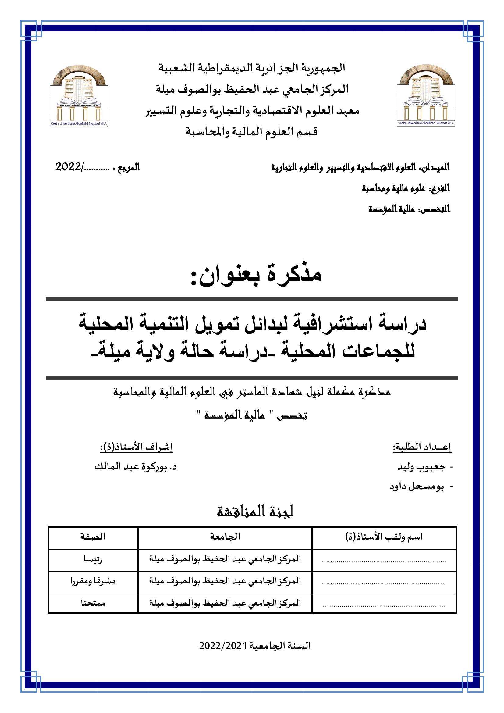 جعبوب وليد et al. (2022). دراسة استشرافية لبدائل تمويل التنمية المحلية للجماعات المحلية : دراسة حالة ولاية ميلة- (ماستر- ل م د) . ميلة.