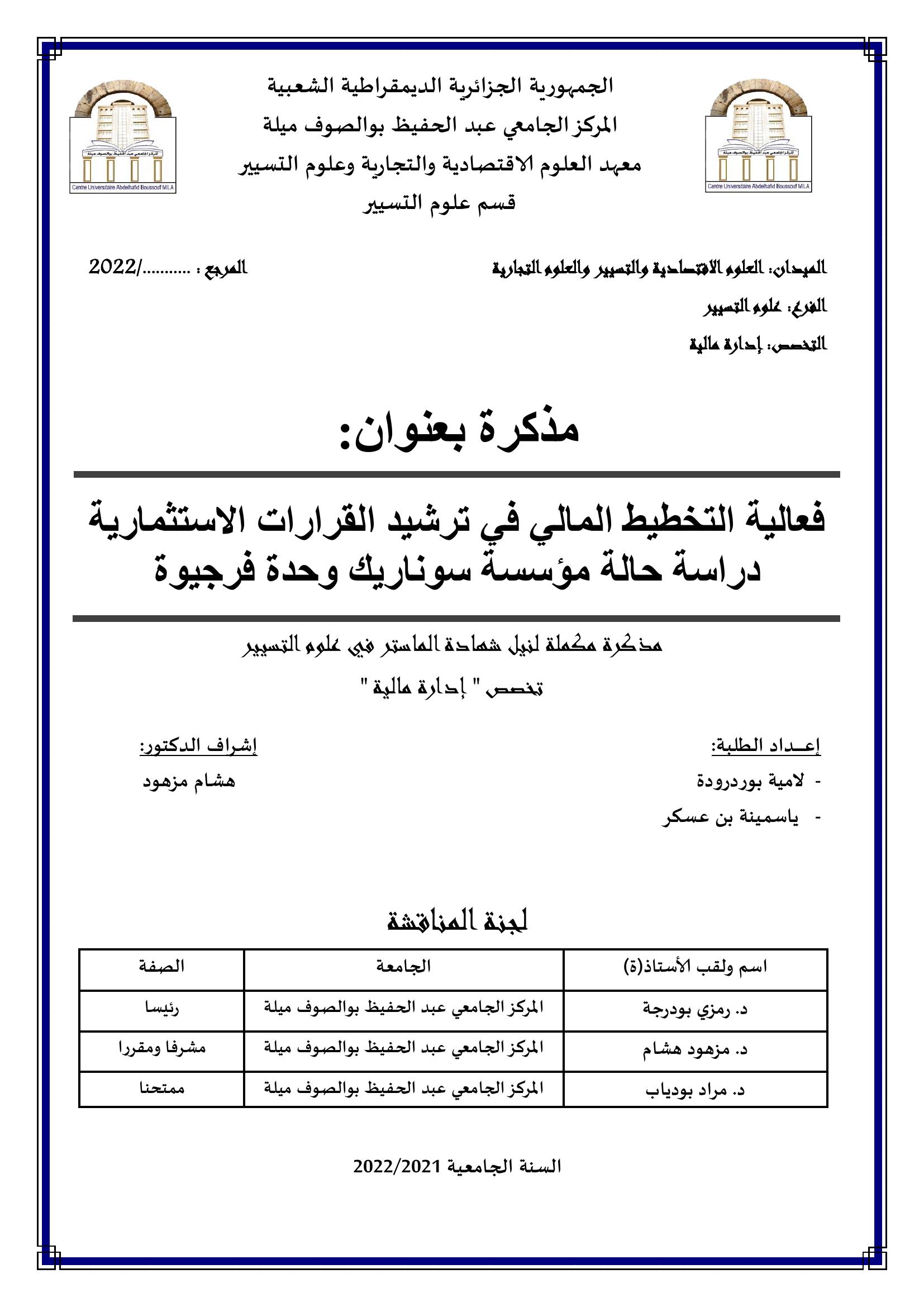 فعالية التخطيط المالي في ترشيد القرارات الاستثمارية : دراسة حالة مؤسسة سوناريك وحدة فرجيوة