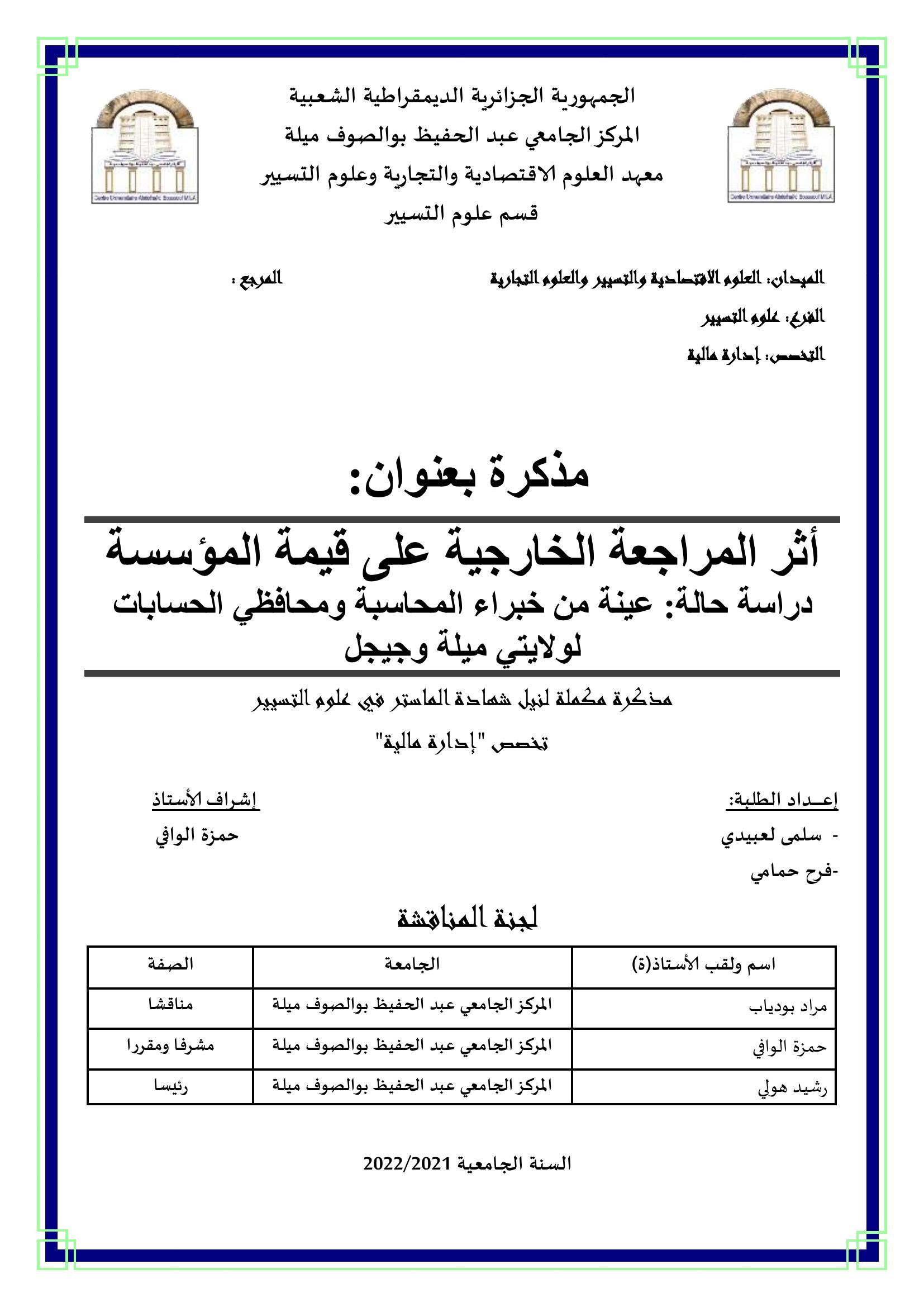 أثر المراجعة الخارجية على قيمة المؤسسة : دراسة حالة: عينة من خبراء المحاسبة ومحافظي الحسابات لولايتي ميلة وجيجل