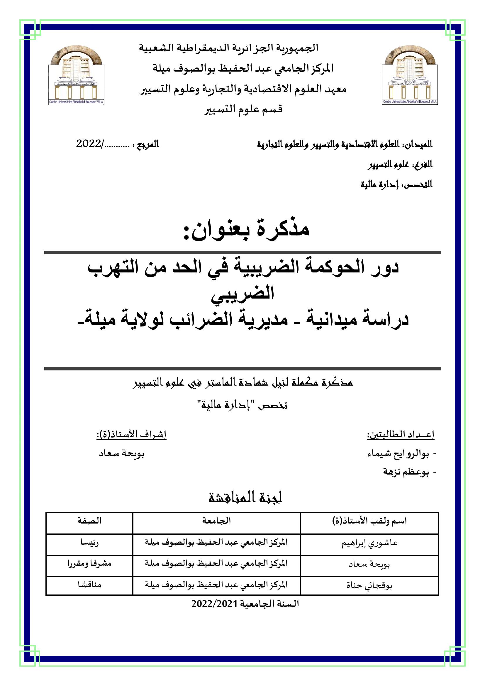 بوالروايح شيماء et al. (2022). دور الحوكمة الضريبية في الحد من التهرب الضريبي دراسة ميدانية مديرية الضرائب لولاية ميلة- (ماستر- ل م د) . ميلة.