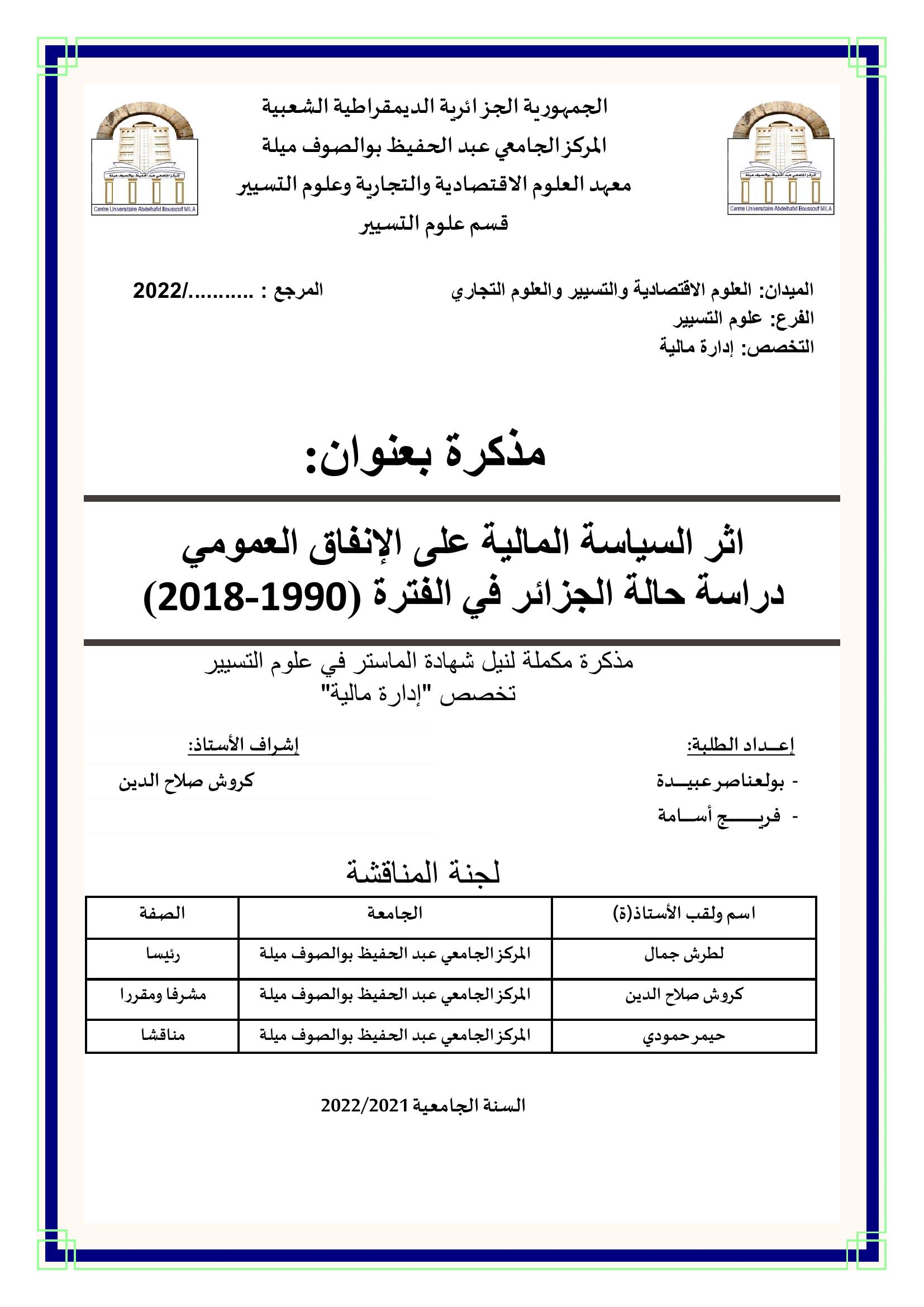 اثر السياسة المالية على الإنفاق العمومي : دراسة حالة الجزائر في الفترة (1990-2018)