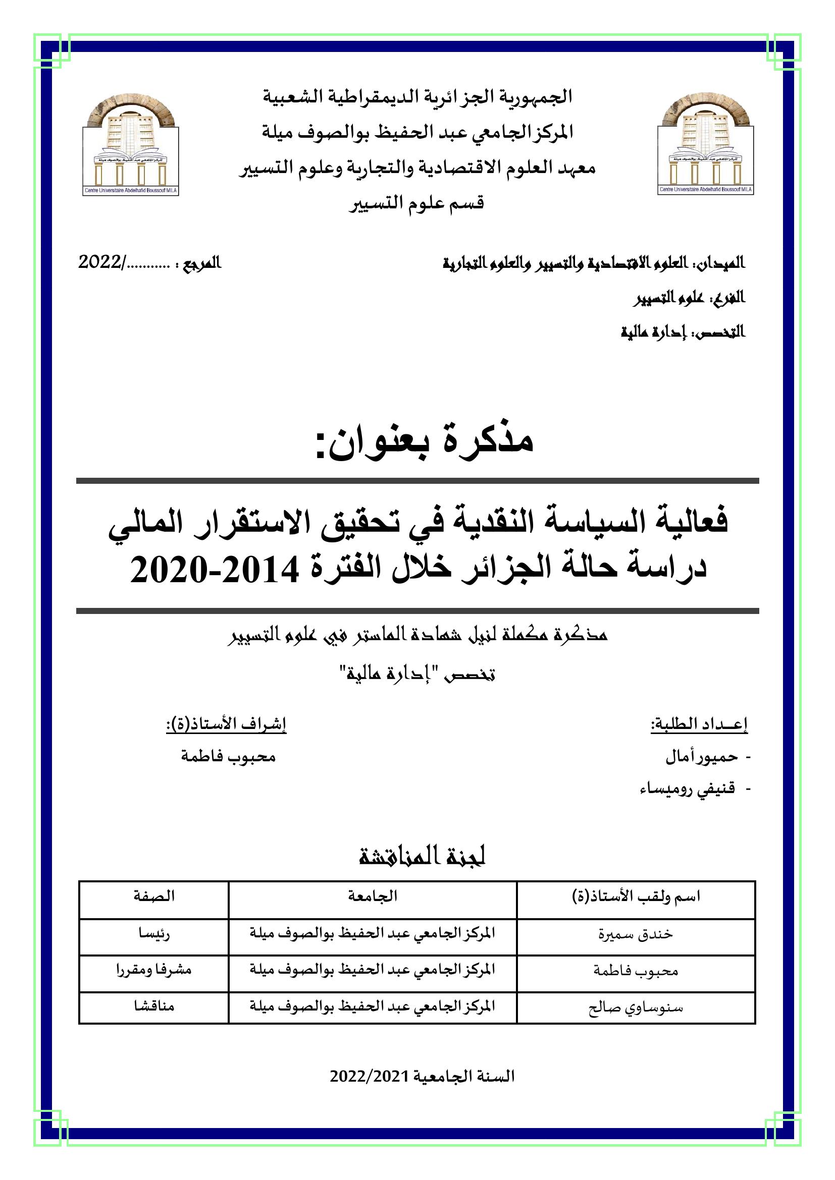 فعالية السياسة النقدية في تحقيق الاستقرار المالي : دراسة حالة الجزائر خلال الفترة 2014-2020