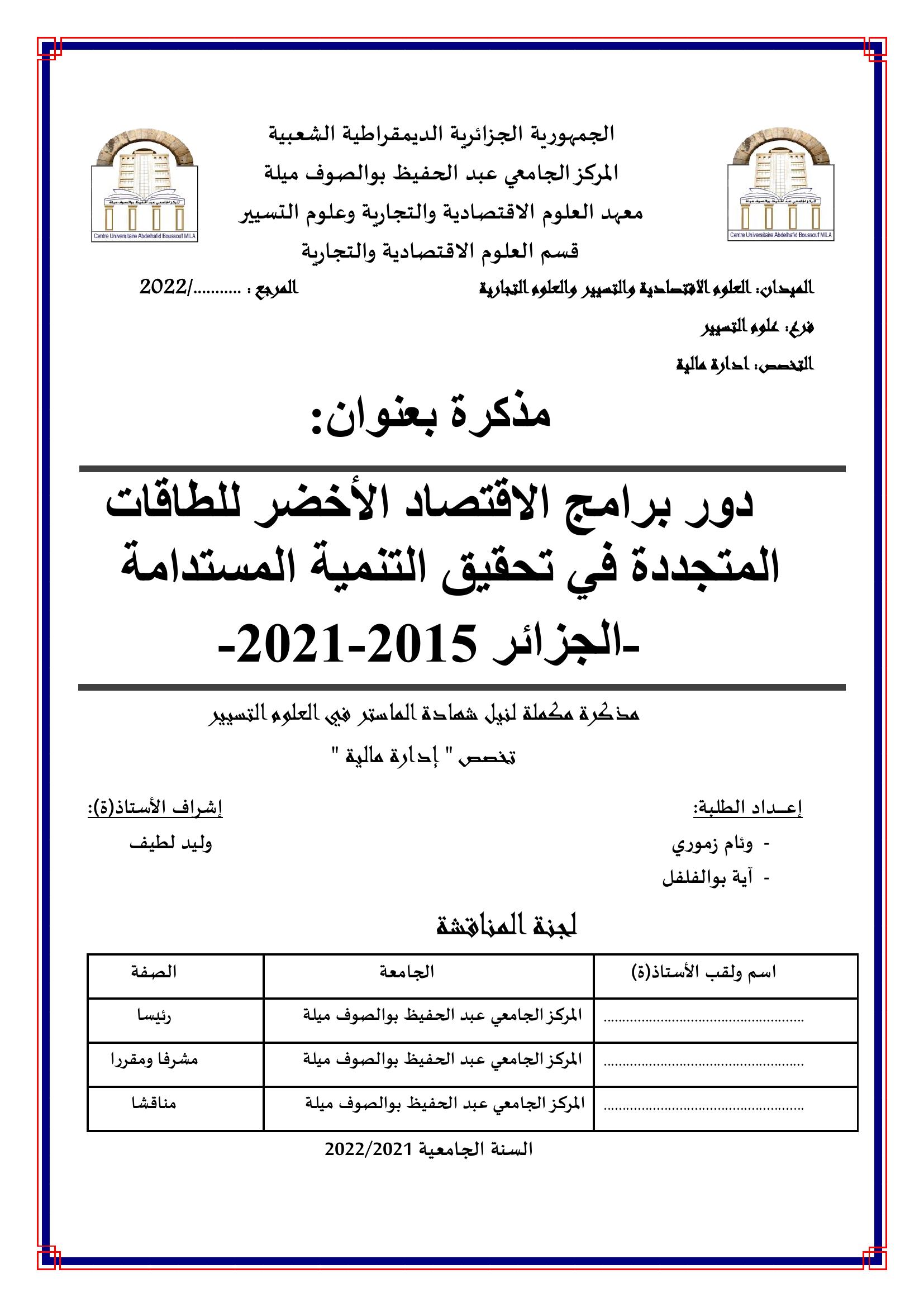 دور برامج الاقتصاد الأخضر للطاقات المتجددة في تحقيق التنمية المستدامة -الجزائر 2015-2021-
