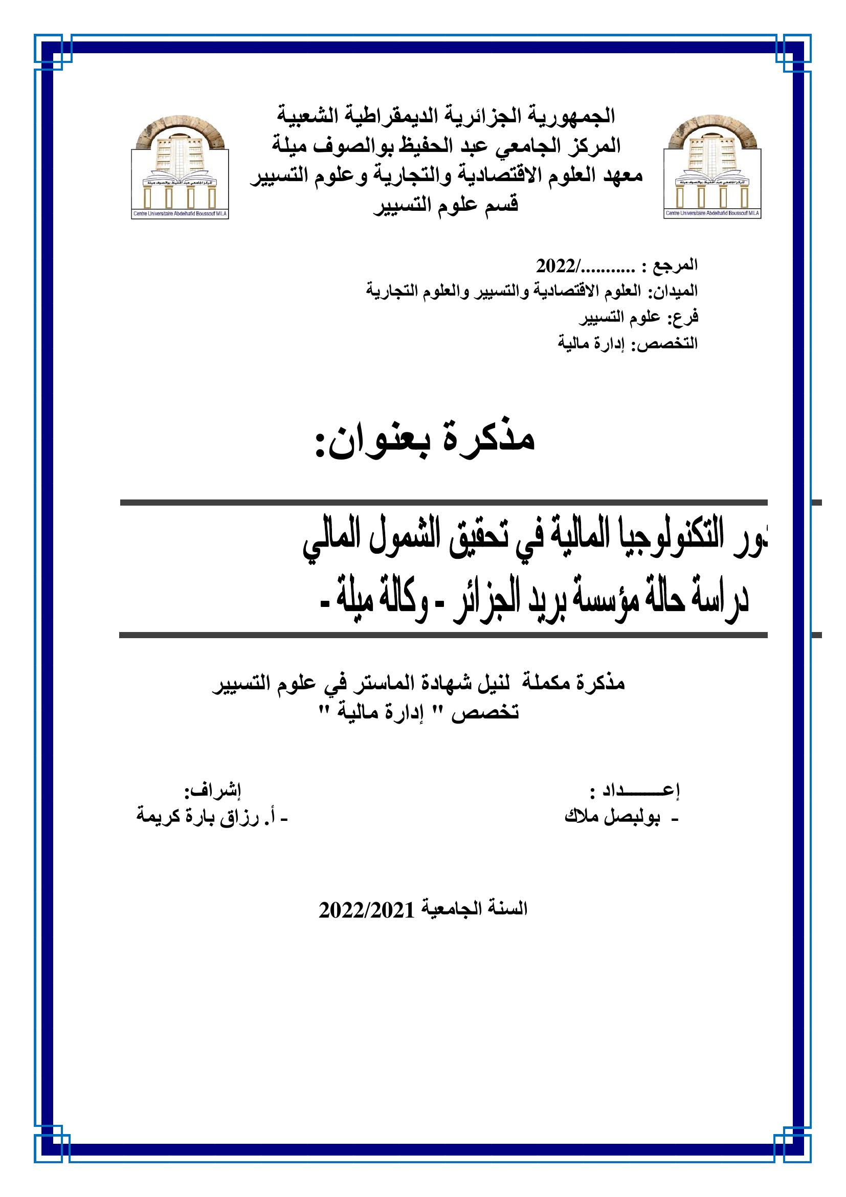 بولبصل ملاك & زيد جابر(رئيسا)،رزاق بارة كريمة (مشرفا ومقررا)،عاشوري إبراهيم(مناقشا) (2022). دور التكنولوجيا المالية في تحقيق الشمول المالي دراسة حالة مؤسسة بريد الجزائر وكالة ميلة (ماستر- ل م د) . ميلة.
